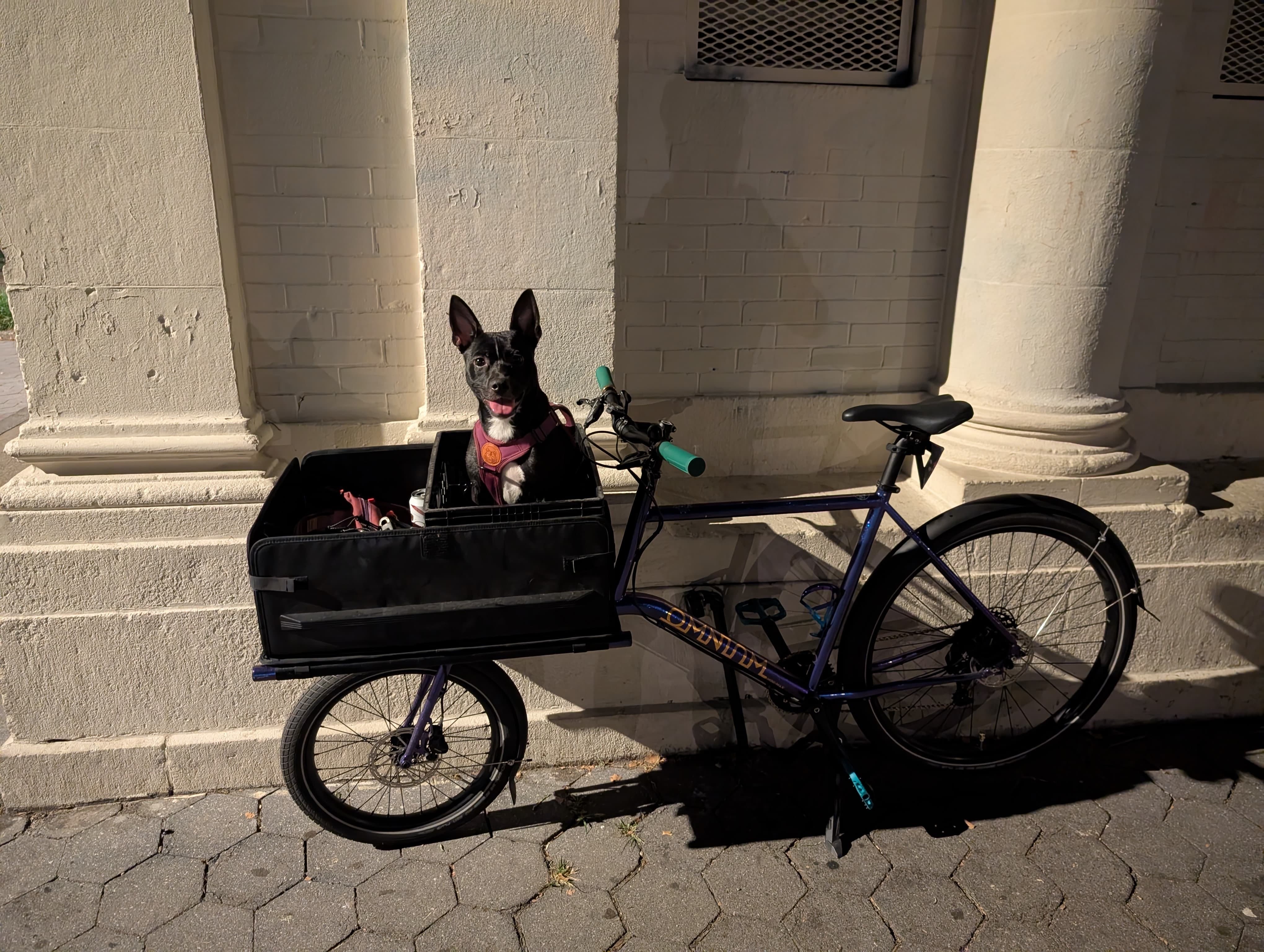 Dom explained that he hopes to participate in an annual cargo bike ride next year. The ride requires several cargo cyclists to climb Bear Mountain together with their dogs up front. “I got my bike two days after that ride. Oh, my God. I was trying to go this past year, but I got my bike too late. Next year, 100 percent doing the dog ride to Bear Mountain. It’s called tour de cargo.”