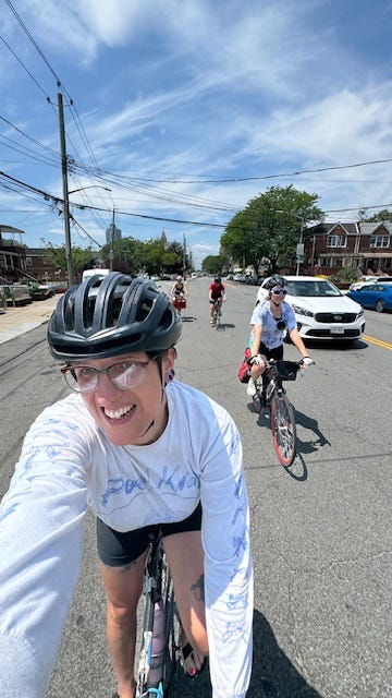Katie challenged herself in 2017 to have her bike be her only means of transportation for at least a year. “No cars, no subways, no planes. I didn’t leave New York. My partner at the time was on board with this. If we were going on a date far away, they would take the subway, and I would bike. We would always end up getting to wherever we were going at the same time.” Katie went on to work as a bike messenger, where she sharpened her knowledge of New York City. “I delivered weed for a couple of years. That got me to understand the city really well. I had a goal in cycling of understanding the city as well as a yellow cab driver does.”