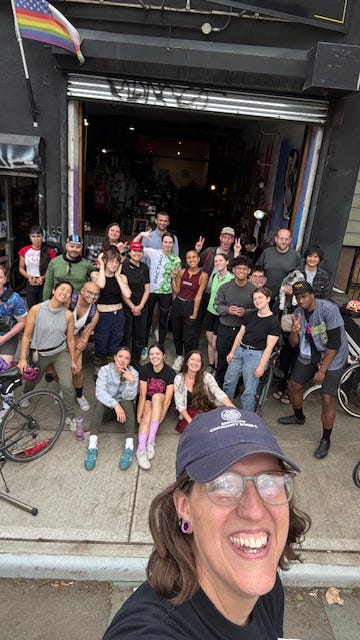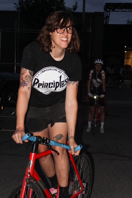 Katie’s experience as a ride leader began in 2019 with Queer Joyride (Formerly FWOD). FWOD was a WTF (women, trans, femme) cycling social group that started sometime in the early 2010s. Over time, the group has evolved to become more gender-inclusive. “Other ride leaders and I wanted a space that was decidedly queer, but was open to anyone. We noticed there were largely two trans groups of people that weren’t comfortable showing up to a ride that was really gender exclusive. Trans men who were very passing felt uncomfortable because it was like, ‘Oh, you don’t want men.’ And then baby trans women who maybe didn’t pass. They felt uncomfortable in a group that was gender defined because they weren’t ready to be out yet.” Ultimately, Queer Joyride has evolved into a welcoming, inclusive space for all queer individuals. “We wanted a space for people to explore their queerness. We decided that we will have a queer ride that is led by queer people, for queer people. We do that ride every Tuesday, weather permitting.”